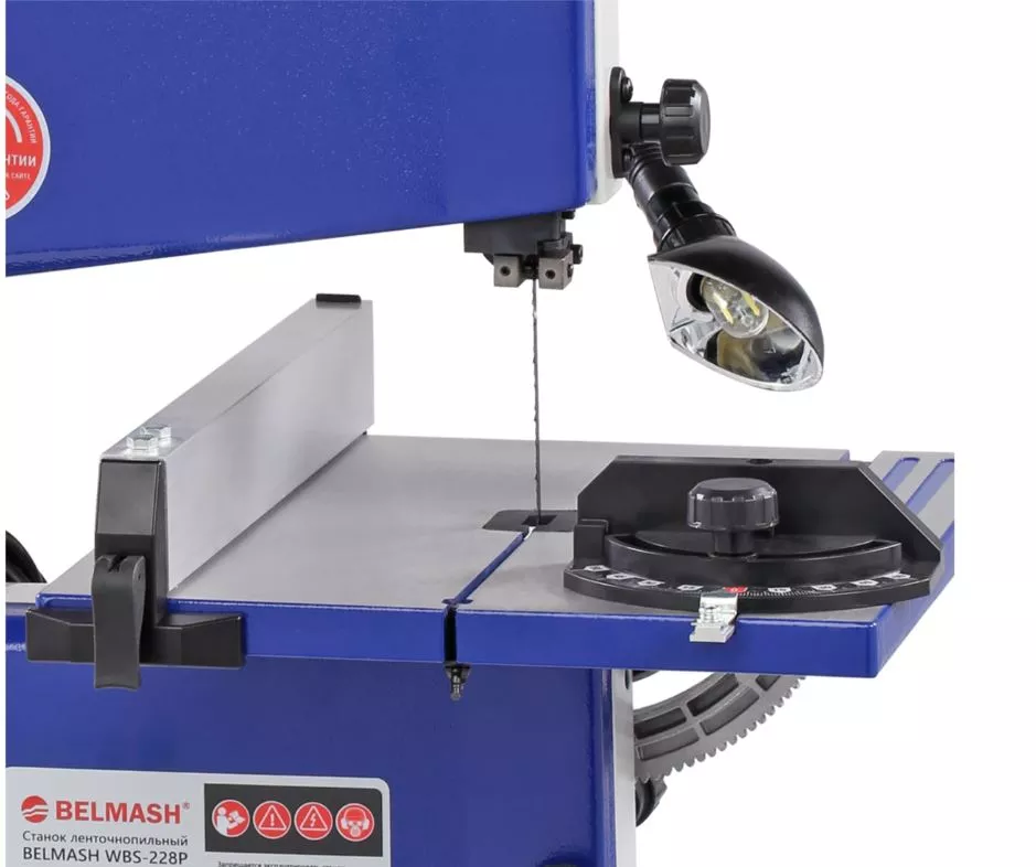Питание станка осуществляется от однофазной сети переменного тока напряжением 230 В. Электродвигатель асинхронный, мощность - 400 Вт. Вращение от двигателя к шкивам передается с помощью ременной передачи. Скорость пильного полотна - 635 м/мин. Модель компактная, установка настольная. Рабочий стол изготовлен из алюминия (313×306 мм), имеет возможность наклона от 0 до 45 градусов. На переднюю часть стола крепится параллельный упор. В столе есть паз для установки углового упора, обеспечивающий угол от -60 до +60 градусов. Просвет до рамы - 228 мм. Максимальная высота обработки - 89 мм. Учитывайте эти параметры при выборе заготовок.