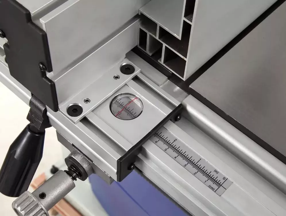 На чугунном столе имеется два Т-образных паза, стандартным размером 19 х 9,5 мм, в который устанавливается угловой упор. На специальной направляющей закрепляется параллельный упор. Сам стол имеет угол наклона от -5 до +45 градусов. Для увеличения площади соприкосновения заготовки рабочий стол оборудован стальным расширением, общий размер рабочей поверхности составляет 730х480 мм.