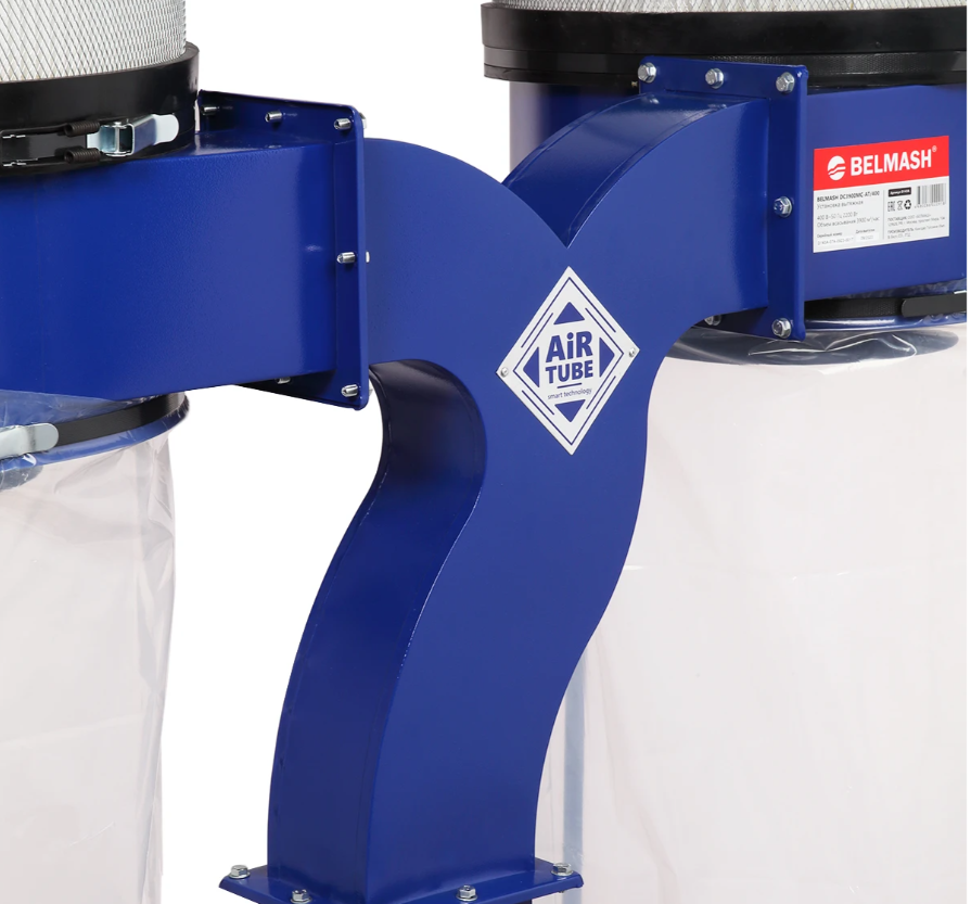 Основной принцип системы Air Tube - это создание вращающегося воздушного потока за счет центробежной силы. Вращение потока воздуха разделяет частицы стружек, опилок и пыли от воздуха. Благодаря специальному разделителю более тяжелые частицы остаются в нижней части системы, а более легкие частицы с воздухом направляются внутрь верхнего фильтра для дальнейшей очистки. С системой Air Tube вы будете реже очищать и менять фильтр-мешок, ощутимо сэкономите бюджет и время на обслуживание вытяжной установки.