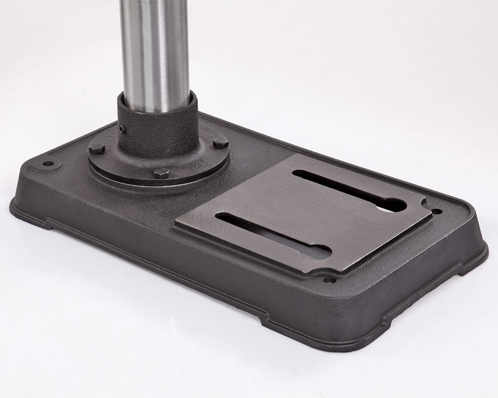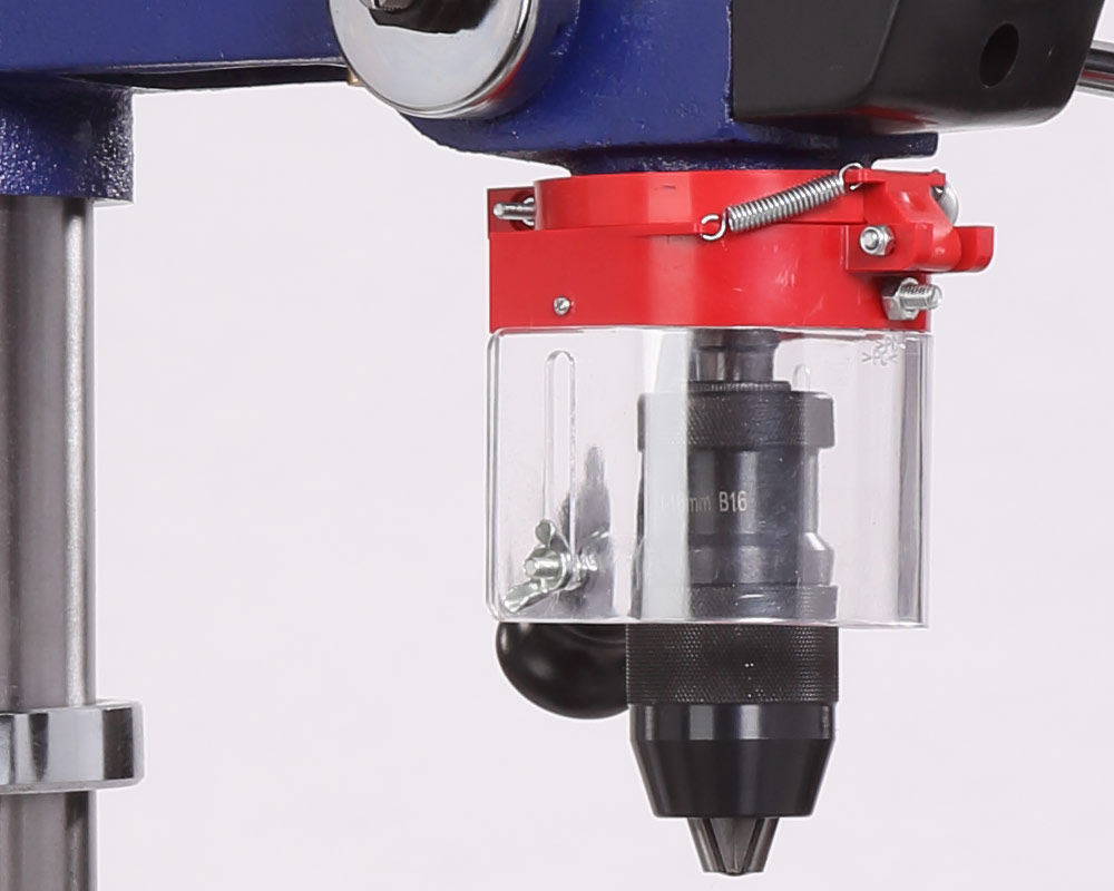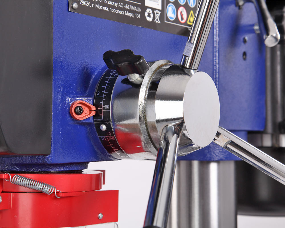 Заготовку можно крепить как к рабочему столу, так и к основанию, все зависит от ее размера. для точного позиционирования точки сверления, станок оснащен лазером - указателем. В комплекте предусмотрены тиски. Для их крепления есть четыре паза на рабочем столе и два на основании. Шкала, расположенная на рукоятке регулировки глубины сверления, показывает ход пиноли шпинделя, с ее помощью можно настраивать ход пиноли, для этого необходимо провернуть шкалу, стрелка на корпусе будет показывать значение, на которое будет возможно погружение сверла, затем затянуть барашек. Наконечники тройной рукояти удобной формы, что способствует плавной подаче сверла к заготовке.