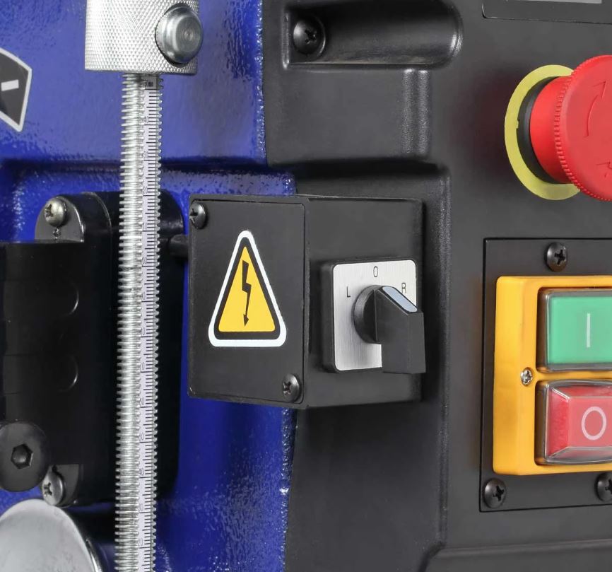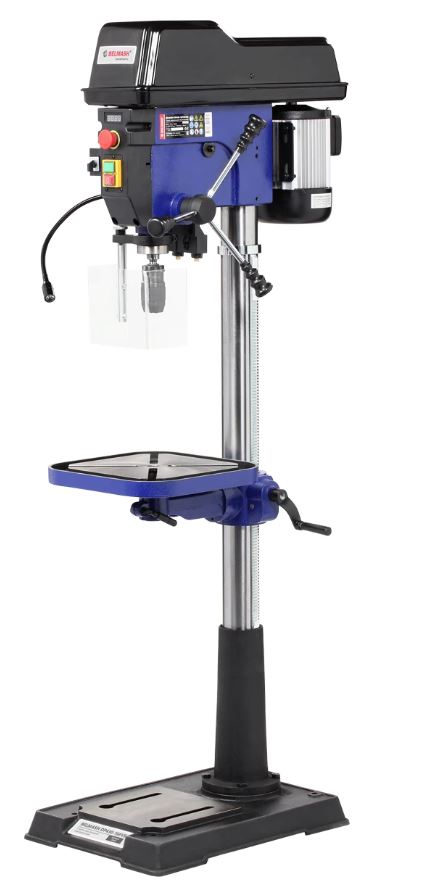 Патрон быстрозажимной с максимальным диаметром зажимаемого хвостовика инструмента 16 мм, посадка В16. На колонне, ее диаметр 80 мм, имеется зубчатая рейка, поднятие/опускание стола настраивается с помощью рукоятки. Управление станком осуществляется кнопками – «пуск», «остановка». Выключатель имеет крышку.