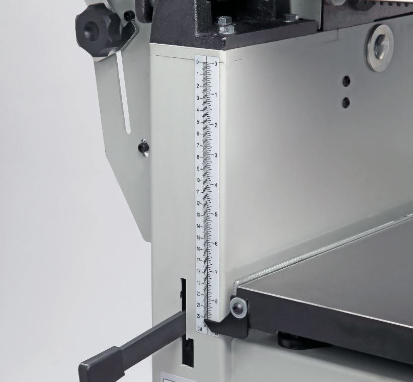 Входящий в базовое оснащение стальной трехножевой строгальный вал прост в эксплуатации (имеет стандартные регулировки), а за счет частоты вращения в 5500 об/мин. обеспечивает чистый рез. Для строгания по торцу или под глом от 90 до 45 градусов станок оборудован параллельным упором, который выполнен в жесткого алюминиевого профиля.
