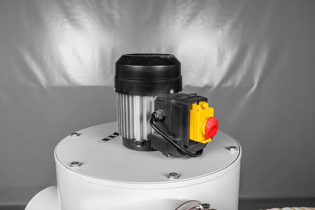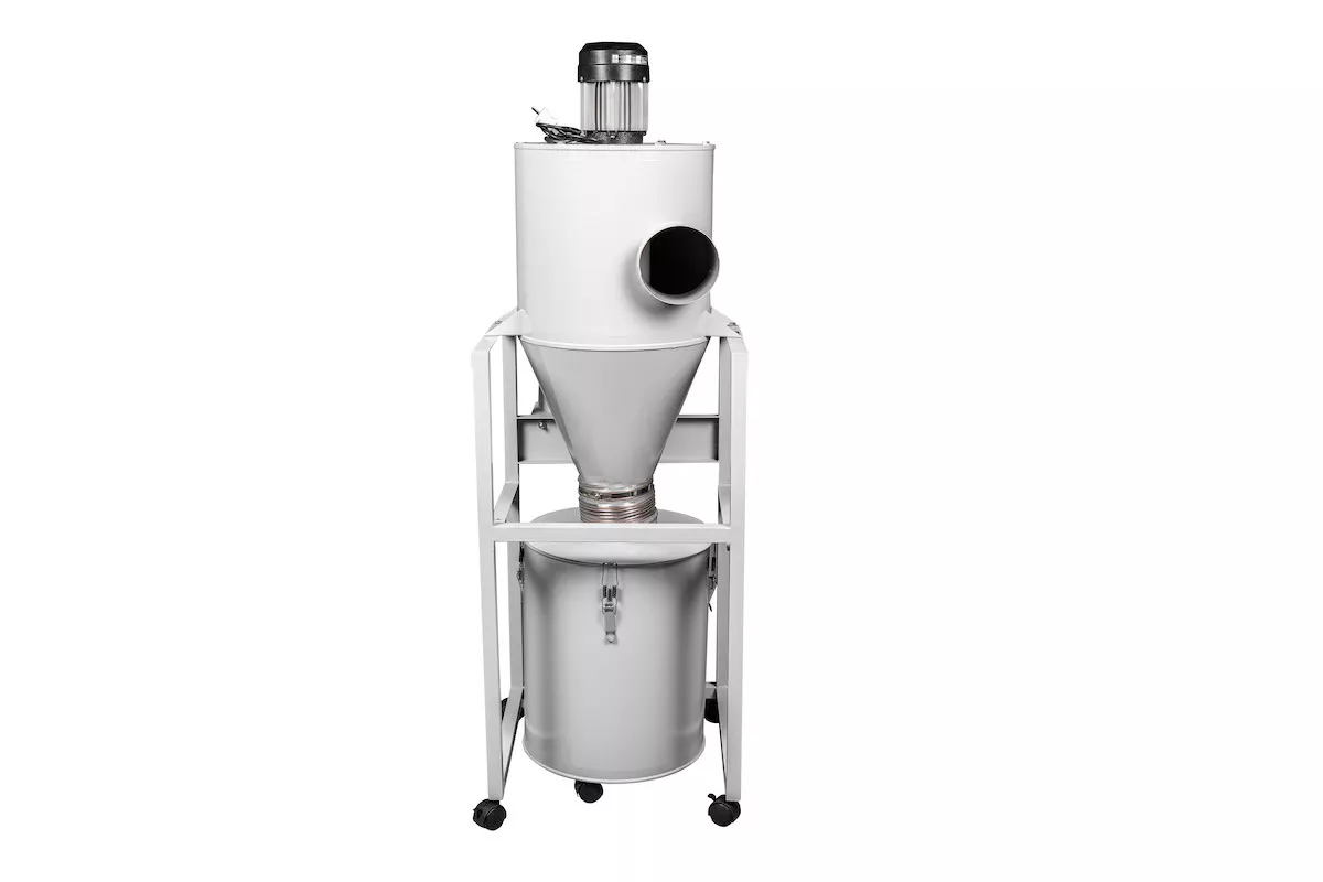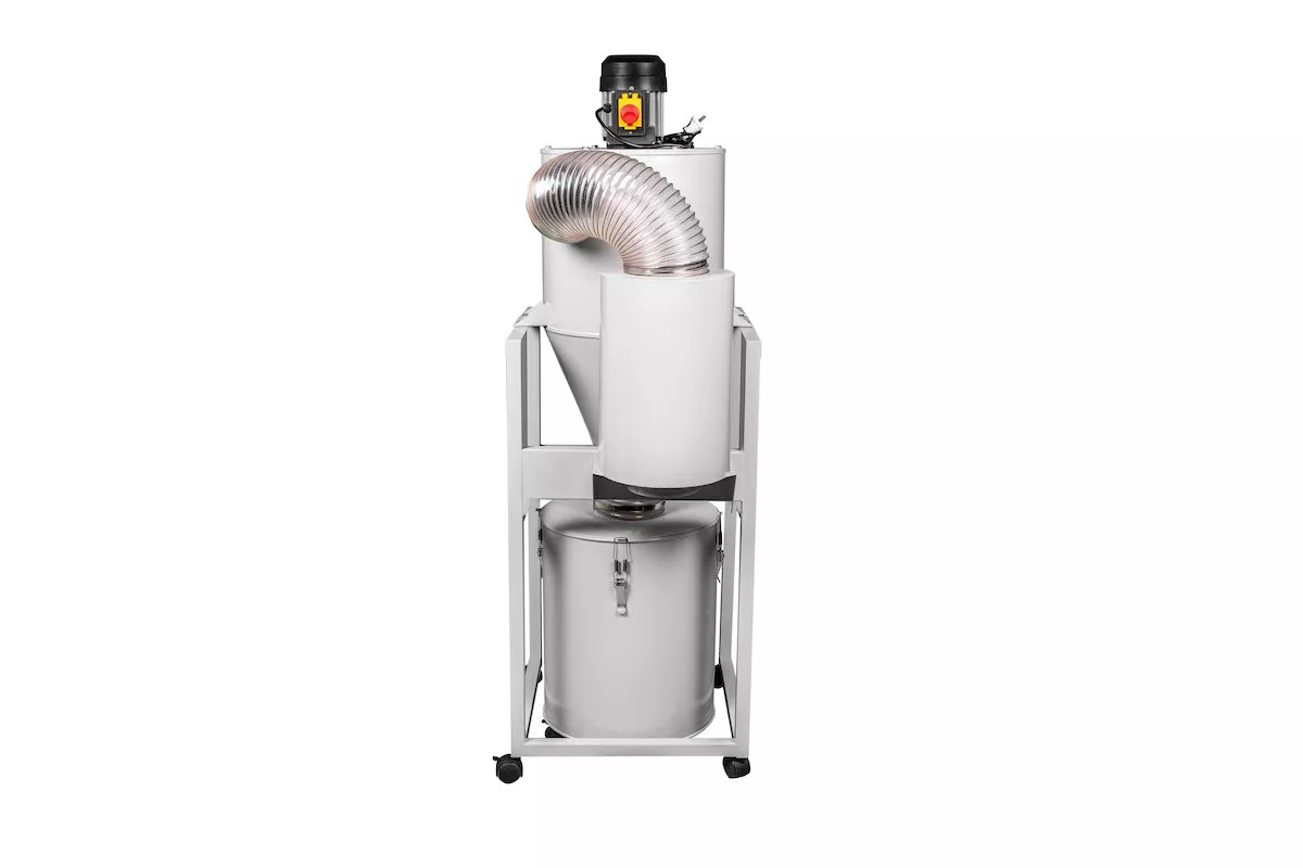 Бункер для сбора опилок выполнен из металла и имеет колесики для удобства перемещения. Она работает от сети 220 вольт и подключается прямо в розетку. Есть кнопка пуска/остановки с функцией защиты. Для подключения используется одна гофрошланга диаметром 100 мм. Шланг подключается сбоку. Несмотря на небольшую мощность (0,75 кВт), данная аспирация благодаря своим конструктивным особенностям обеспечивает достойную производительность в 2000 м³/час.
