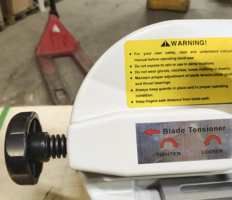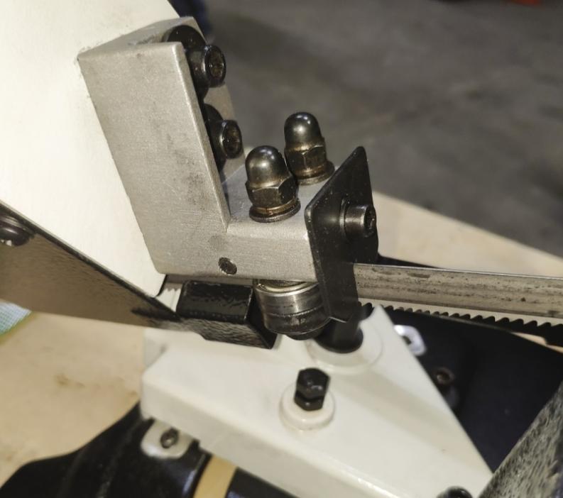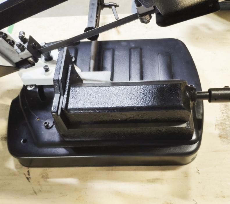 Режущий инструмент – бесконечная сварная ленточная пила. Полотно натягивается с помощью натяжного шкива. Натяжной шкив приводится в движение приводным шкивом, который в свою очередь, приводится через редуктор. Зажим заготовки осуществляется тисками вручную, подача заготовки - также вручную.