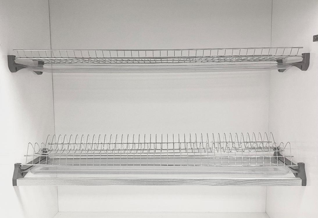 Двухуровневая сушилка для посуды — функциональное решение для хранения и сушки тарелок и чашек в кухонном гарнитуре.Излишки воды скапливаются на пластиковых поддонах, которые легко вынимаются и ставятся на место.